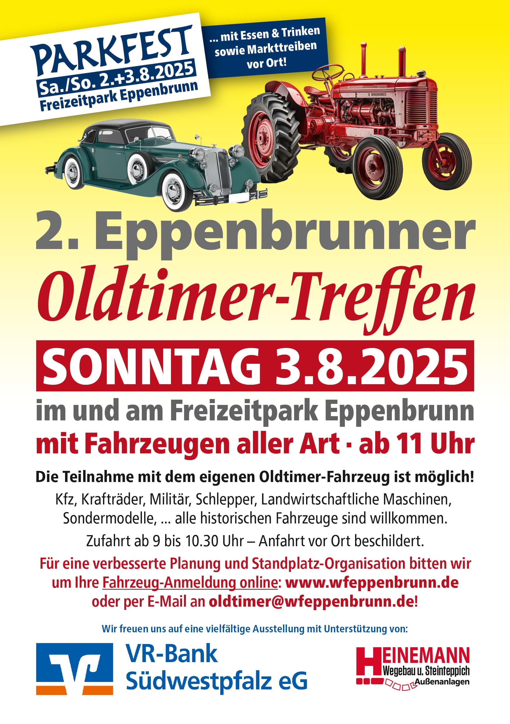 Bereits jetzt Fahrzeuge anmelden für das »Parkfest 2025« mit Oldtimer-Ausstellung? Hier kommen Sie zur Info- und Anmelde-Seite. Oder klicken Sie im Hauptmenü auf Termine -> Parkfest 2025.