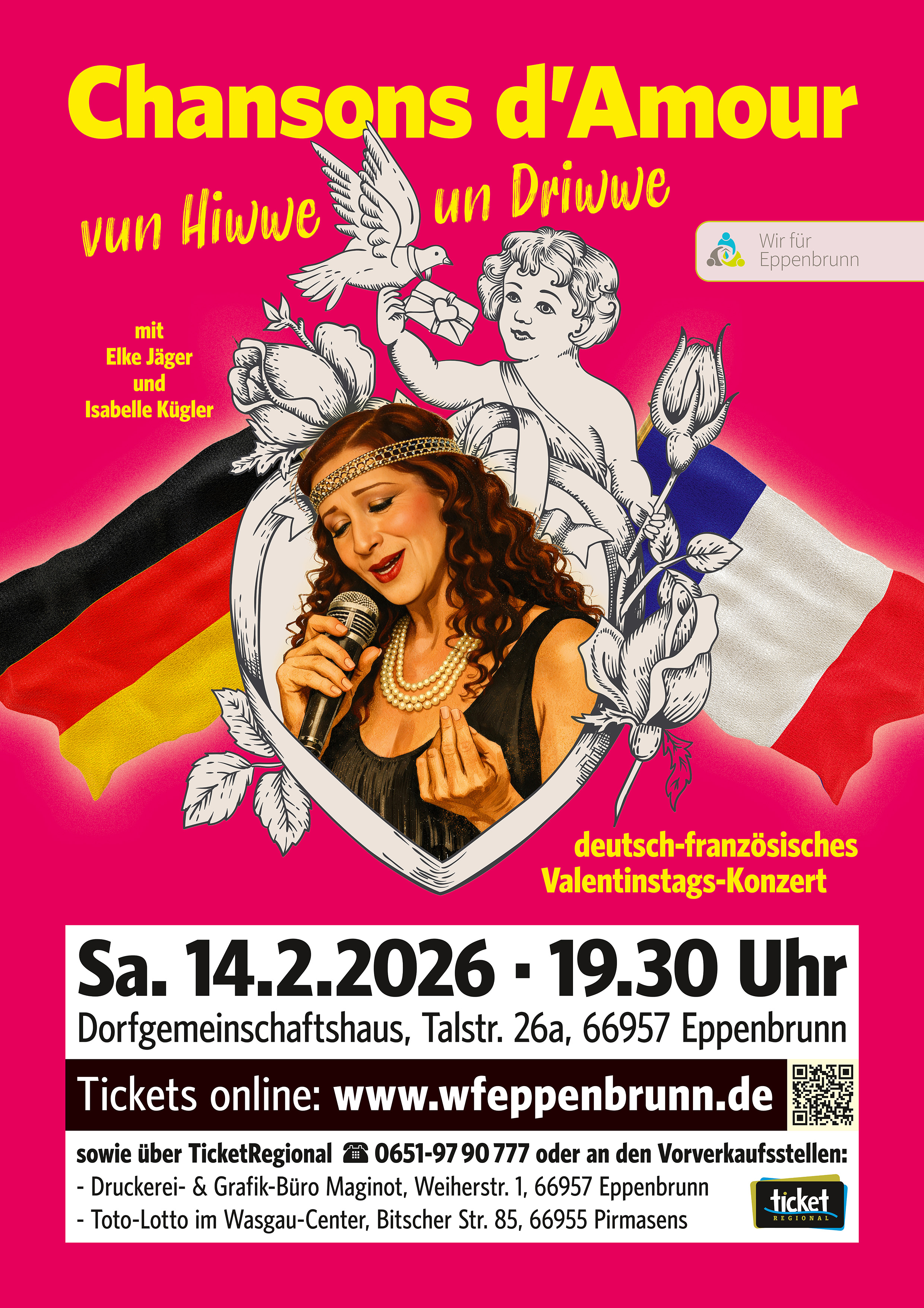 Ein Abend für Herz, Ohr und Auge: Am Samstag, 14. Februar 2026, lädt Wir für Eppenbrunn e.V. um 19:30 Uhr ins Dorfgemeinschaftshaus Eppenbrunn zu einem besonderen Valentins-Konzert ein. Einlass ist ab 18:30 Uhr. Unter dem Titel „Chansons d’Amour vun Hiwwe un Driwwe“ entführt die Chanteuse Elke Jäger ihr Publikum in die Welt großer Gefühle, zeitloser Melodien und unvergessener Klassiker.